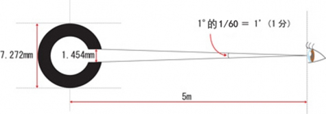 檢查距離5米為基準的視力值1.0的蘭多爾特環的開口間隙尺寸1’=1.454mm,大小5’=7.272mm。其他的視力的開口間隙尺寸,可以通過以上公式來求取。這和使用其他視力來除以1.0的視標是相同的。