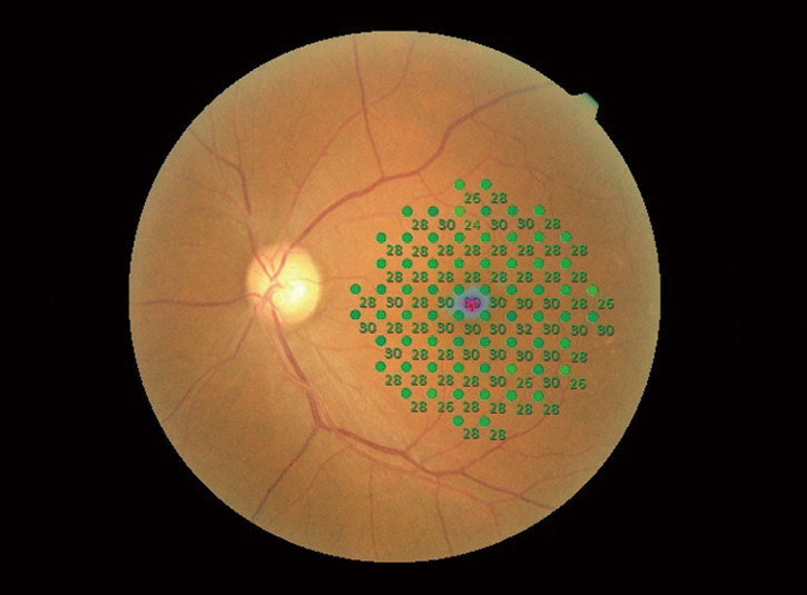 視敏度圖可以灰階顯示視敏度變化,類似于傳統(tǒng)的視野報(bào)告。該顯示可以更直觀的評估視網(wǎng)膜靈敏度。