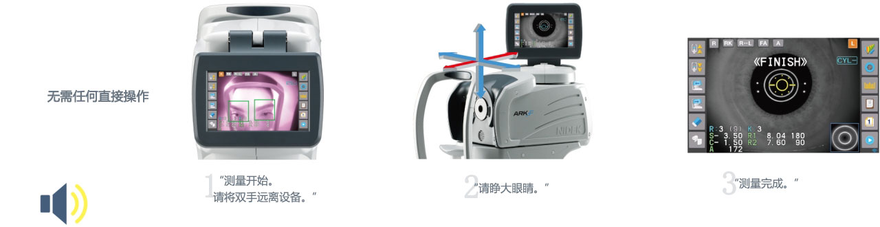 只需將下頜放在托架上,NIDEK眼球偵測相機就能自動檢測眼睛位置,并且無需任何按鈕即可開始測量。全程親切的語音引導,方便不同的操作人員順利的完成測量。