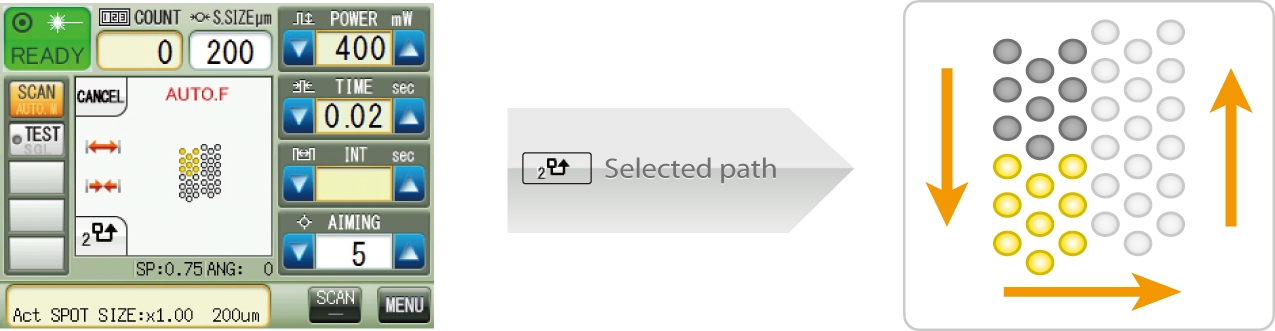 *自動(dòng)步進(jìn)功能可用于等距模板(2v2、3v3、4v4)和正方形模板(2x2、3x3、4x4)。 根據(jù)掃描模板、光斑大小和間距,自動(dòng)步進(jìn)的次數(shù)可能不同。